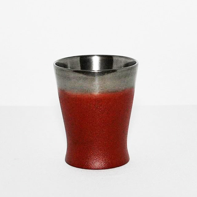 銀地(シルバー)を用いた木製漆器。全国漆器展 経済産業大臣賞受賞の逸品です。「銀彩」とは、漆に銀粉を撒き、漆を塗り固め、研ぎ出しつつ銀の粒を削り、最後は手で直に磨くことで銀本来の色艶を出す技法のこと。金属的な質感ですが、手に取った時に温もりを感じられ、どなたにも愛させるぐい呑みです。すっきりとした朱色も粋ですね。