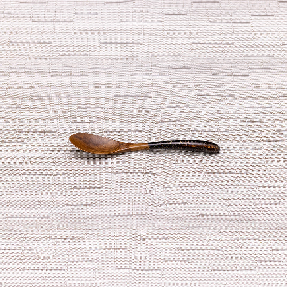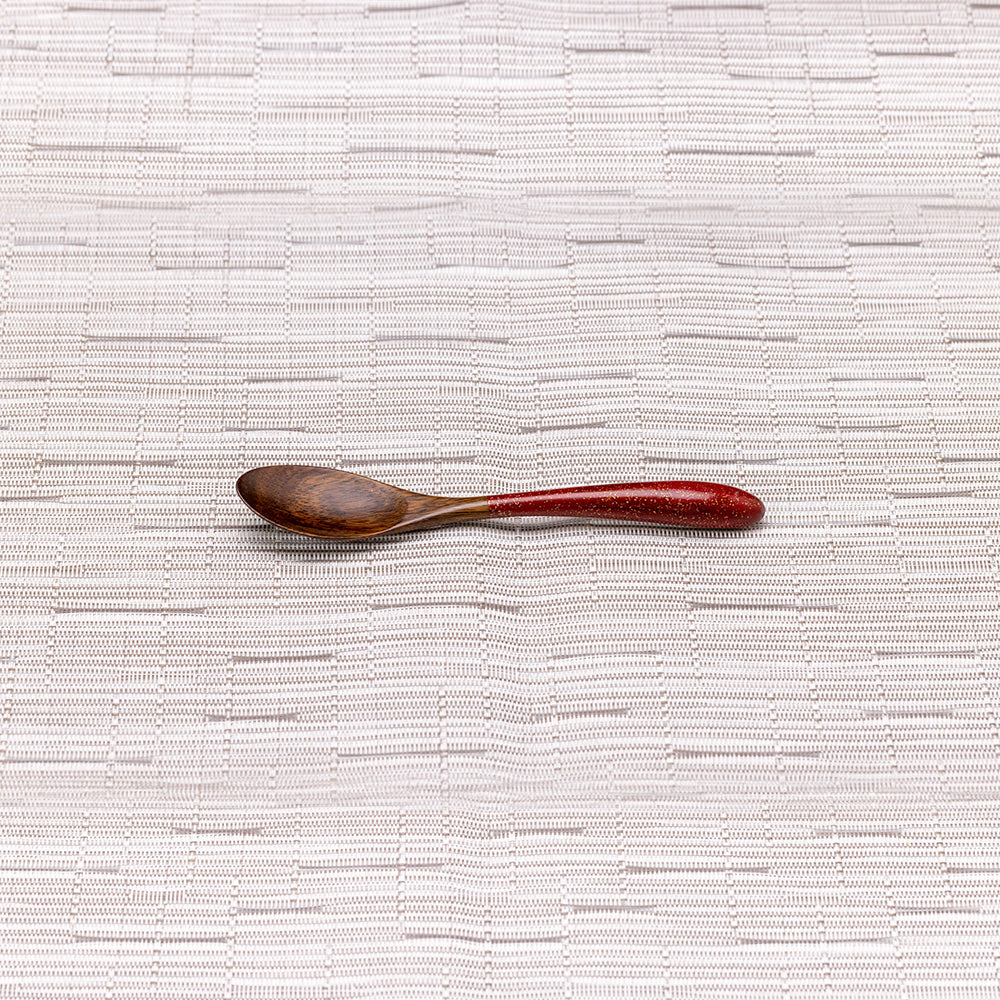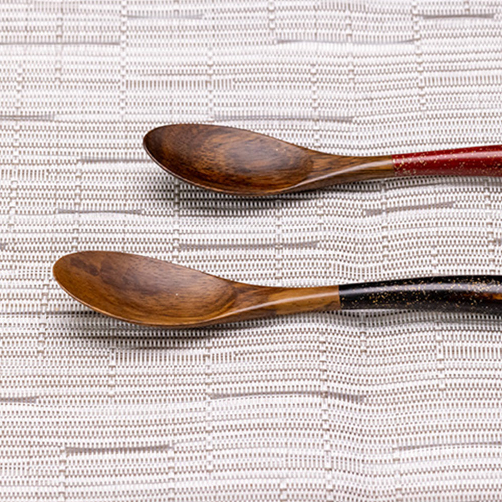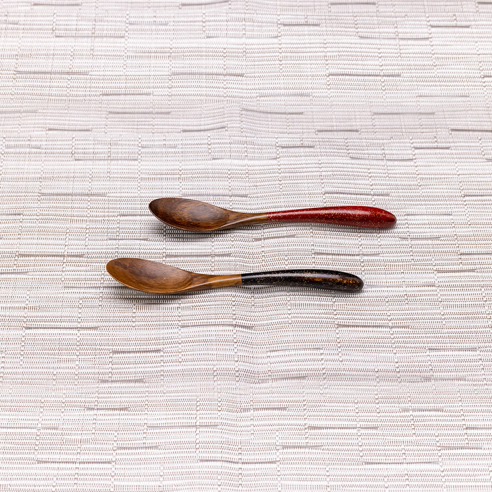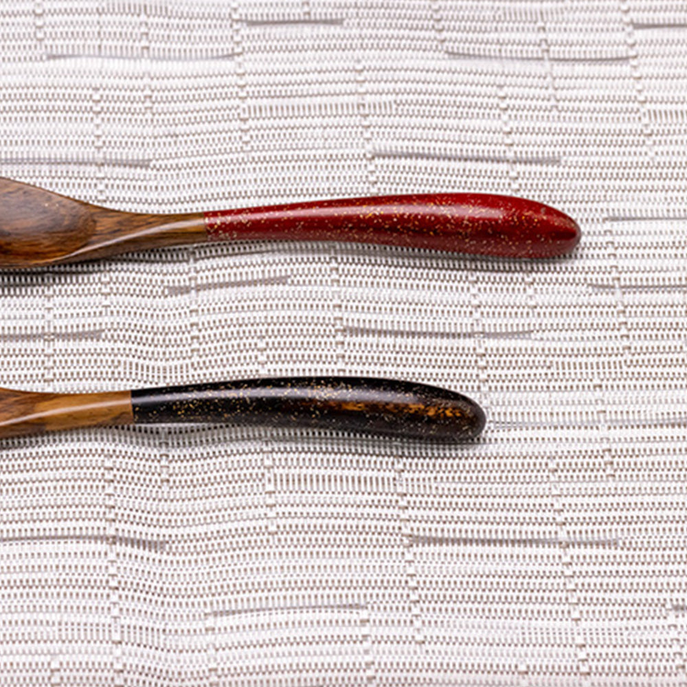 漆を幾重にも重ね塗りをして表面を研ぐことによって、様々な模様を生み出す「研ぎ出し」が施されているスプーンです。持つ部分が赤と黒の2種類あります。