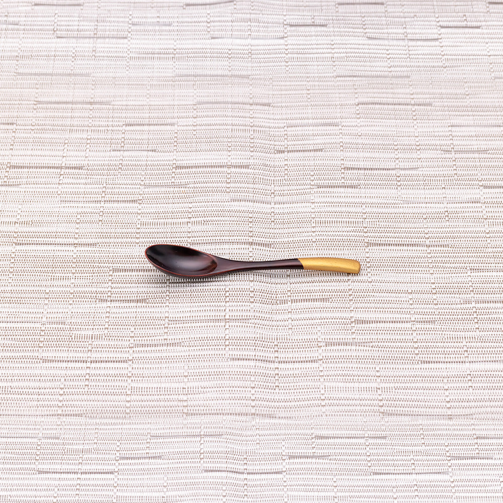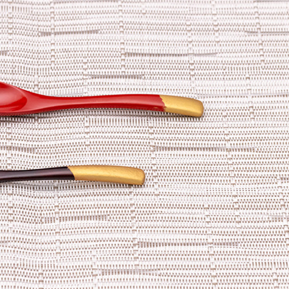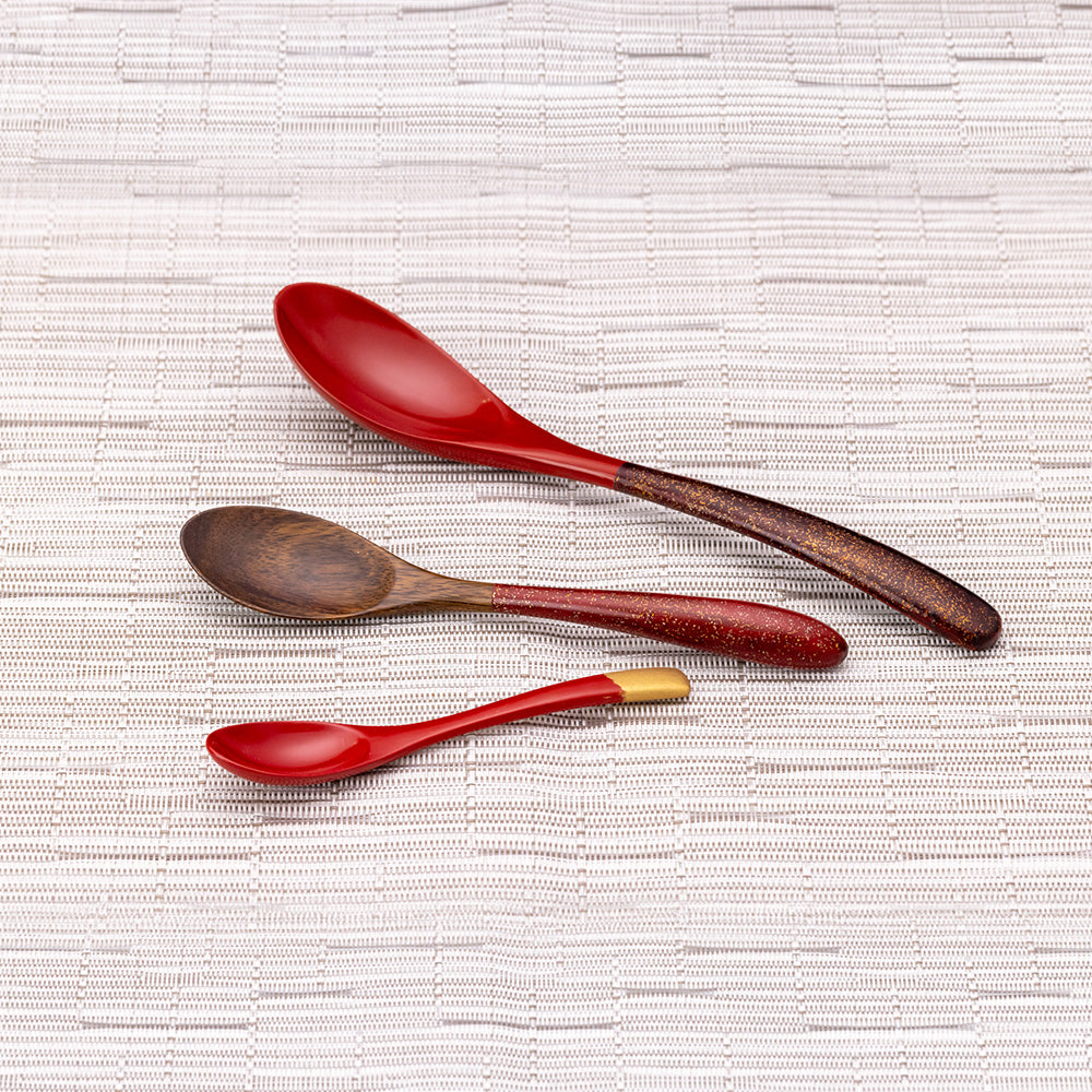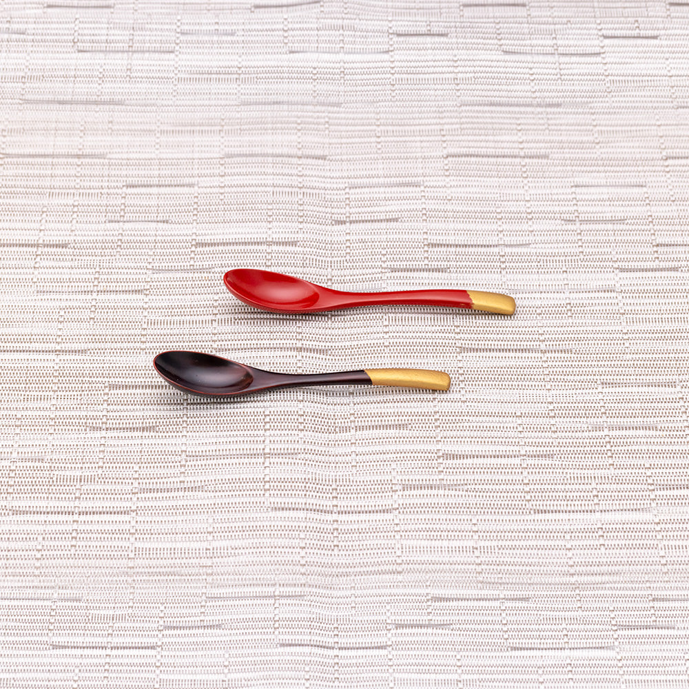 持つところに金粉が塗られている漆の小さなスプーンです。赤と黒の2種類あります。