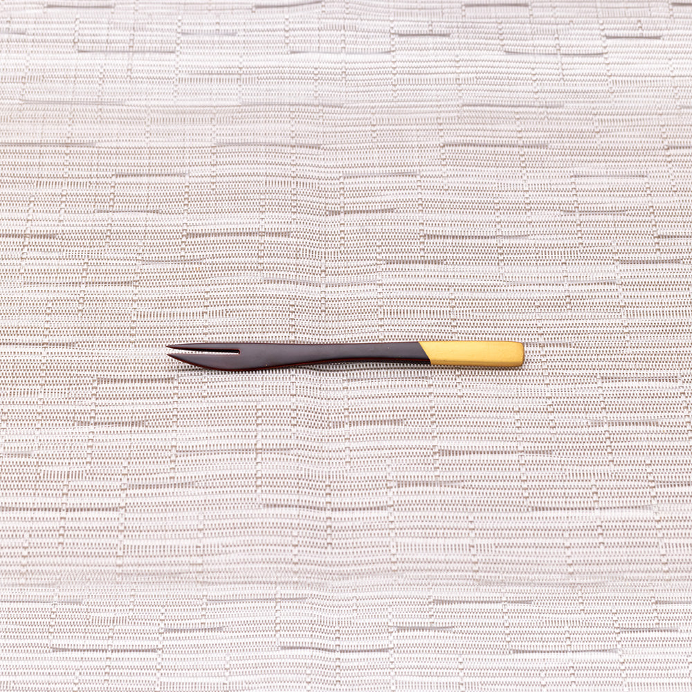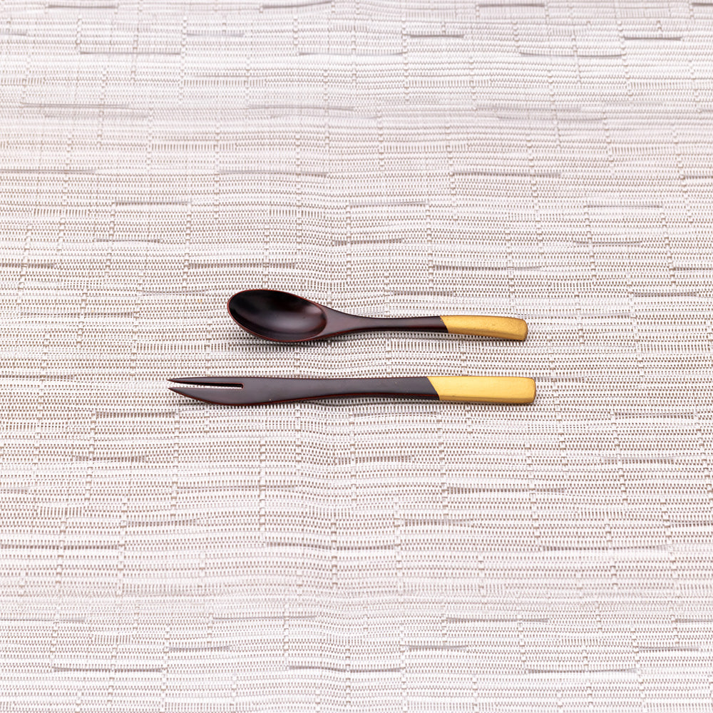 持つところに金粉が塗られている漆の小さなフォークです。赤と黒の2種類あります。
