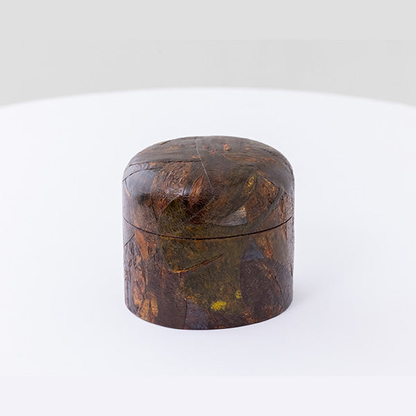 木の葉の形に切ったちらし皮に、ほのかに着色してから貼付。冷たく強い秋風が吹いた後に、葉っぱが地面に重なり落ちている様子を表現。裏は寒い冬が来ることを暗示して水たまりに氷が張る様を表現。