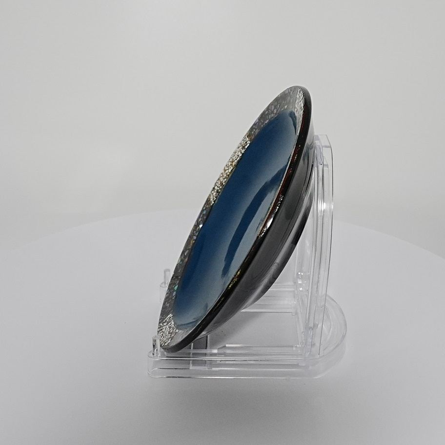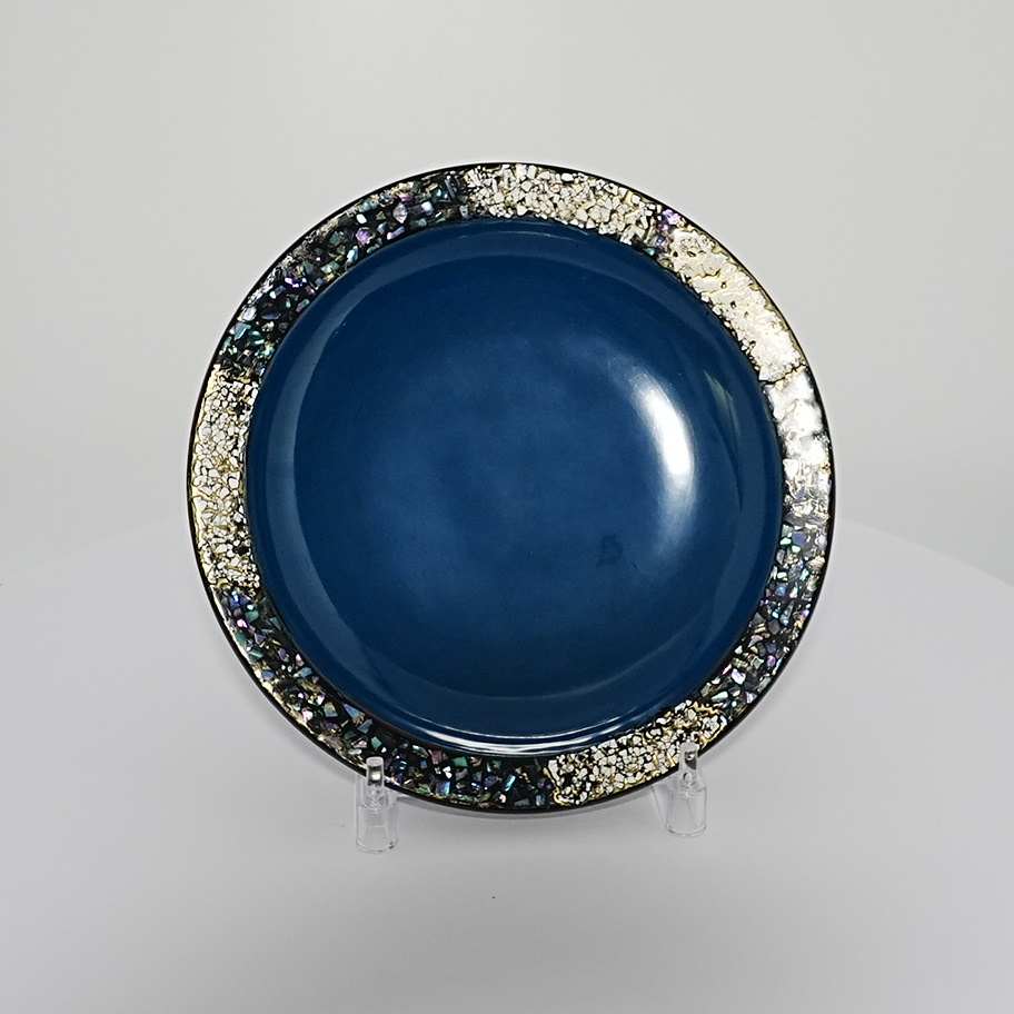伝統漆器の技法を基調としながら、現代的なデザイン性を取り入れるのが齋藤氏の特徴です。「螺鈿(らでん)」という貝を施した装飾と卵殻が漆の縞模様とともに、輝きを放ち、碧の独特の世界を作り出しています。