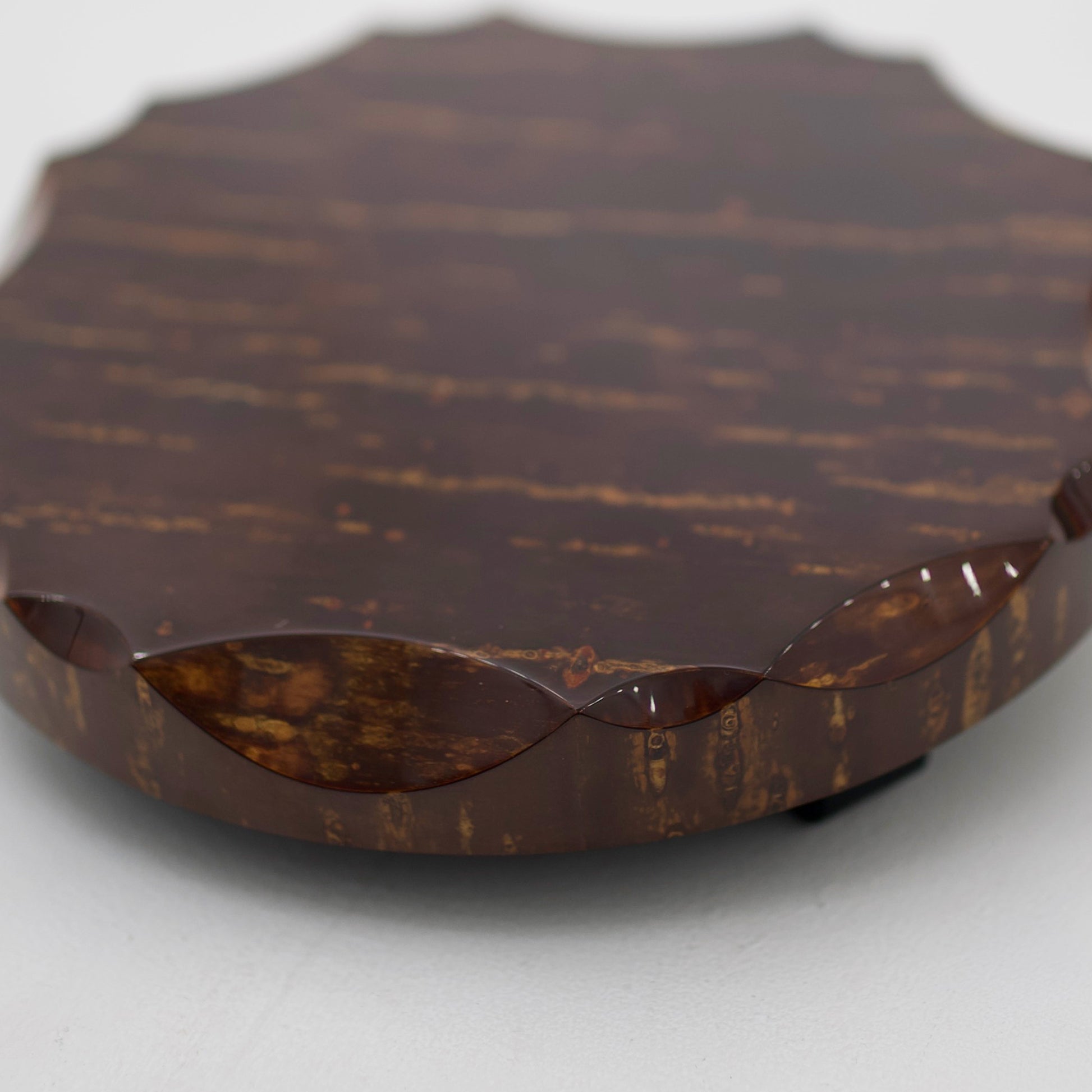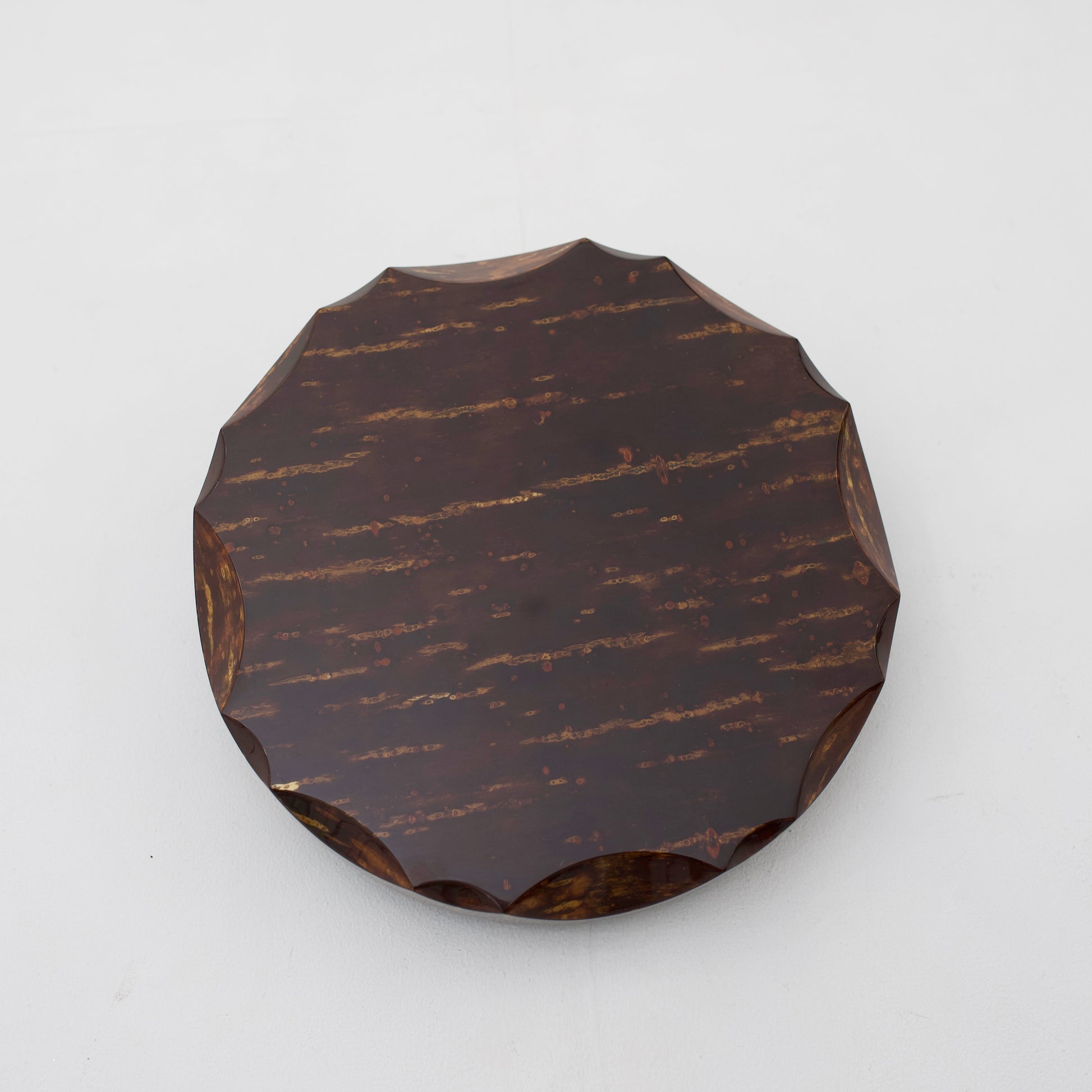 脚付きの尺置き台です。上部は贅沢に一枚皮を使用しており、そのエッジ部分に飾り面取りを施して色の薄い飴皮を貼り付けてあります。