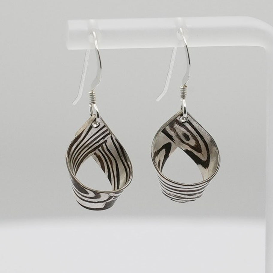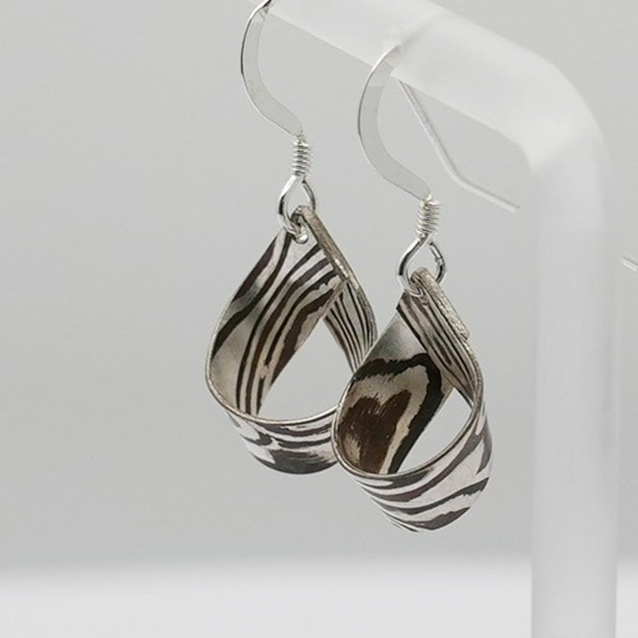銀・銅などの複数の金属を材料として、熱や圧力を加えて融着し、成型、研磨を経て生み出されています。杢目銅独特の模様のピアスはハレの日もカジュアルなシーンでもあなたを印象づけるでしょう。