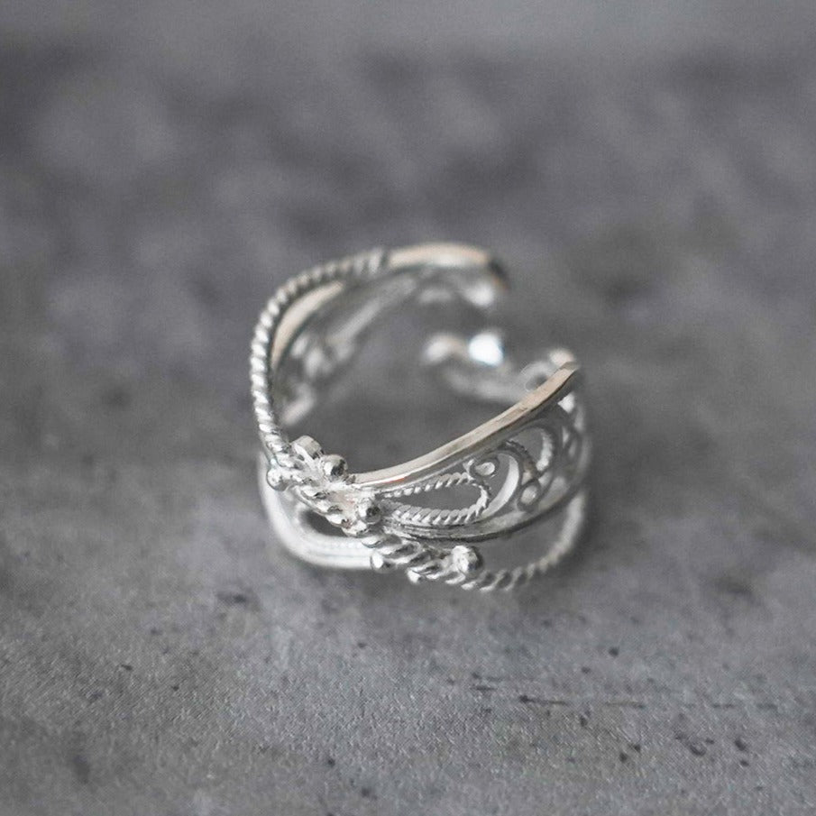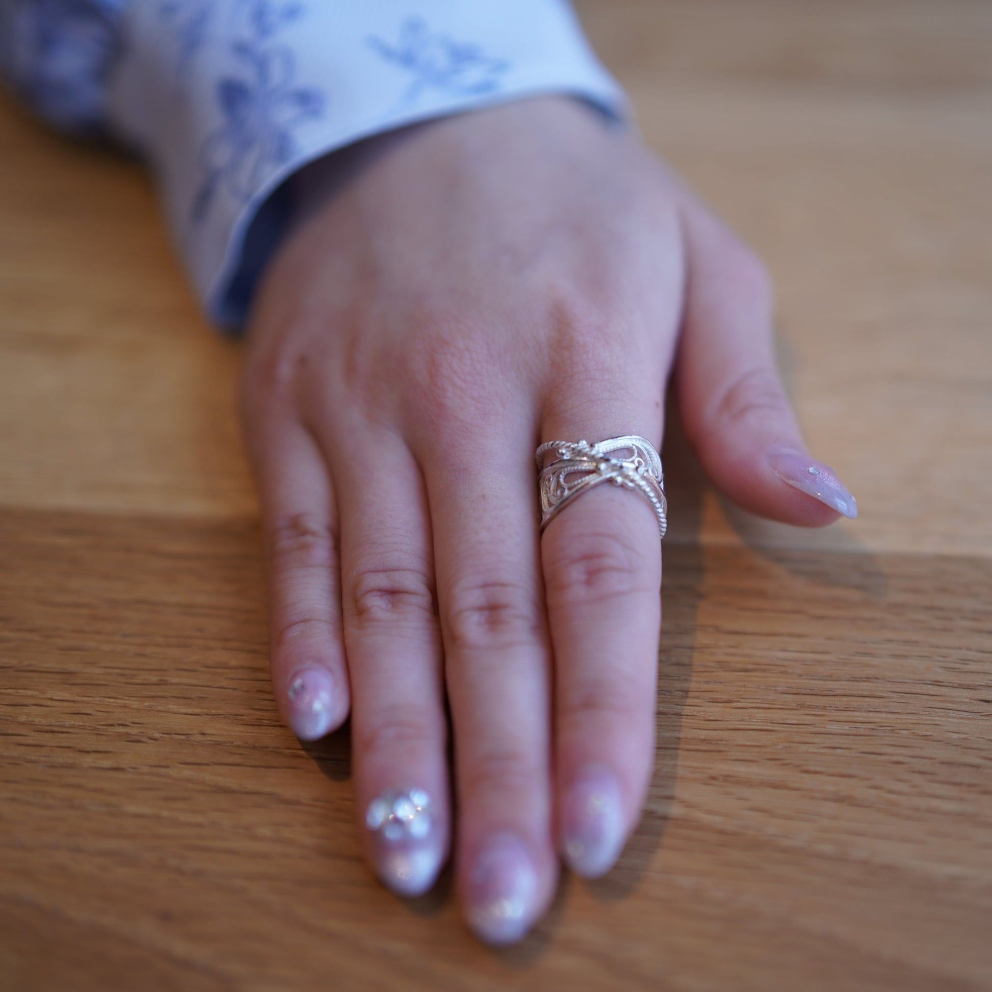 いつもは繊細な銀製細工が特徴ですが、太めの銀線で作られた唐草模様のデザインが目を引きます。大ぶりのアクセサリーを好む方に、また個性的なリングを求める男性に好評です。