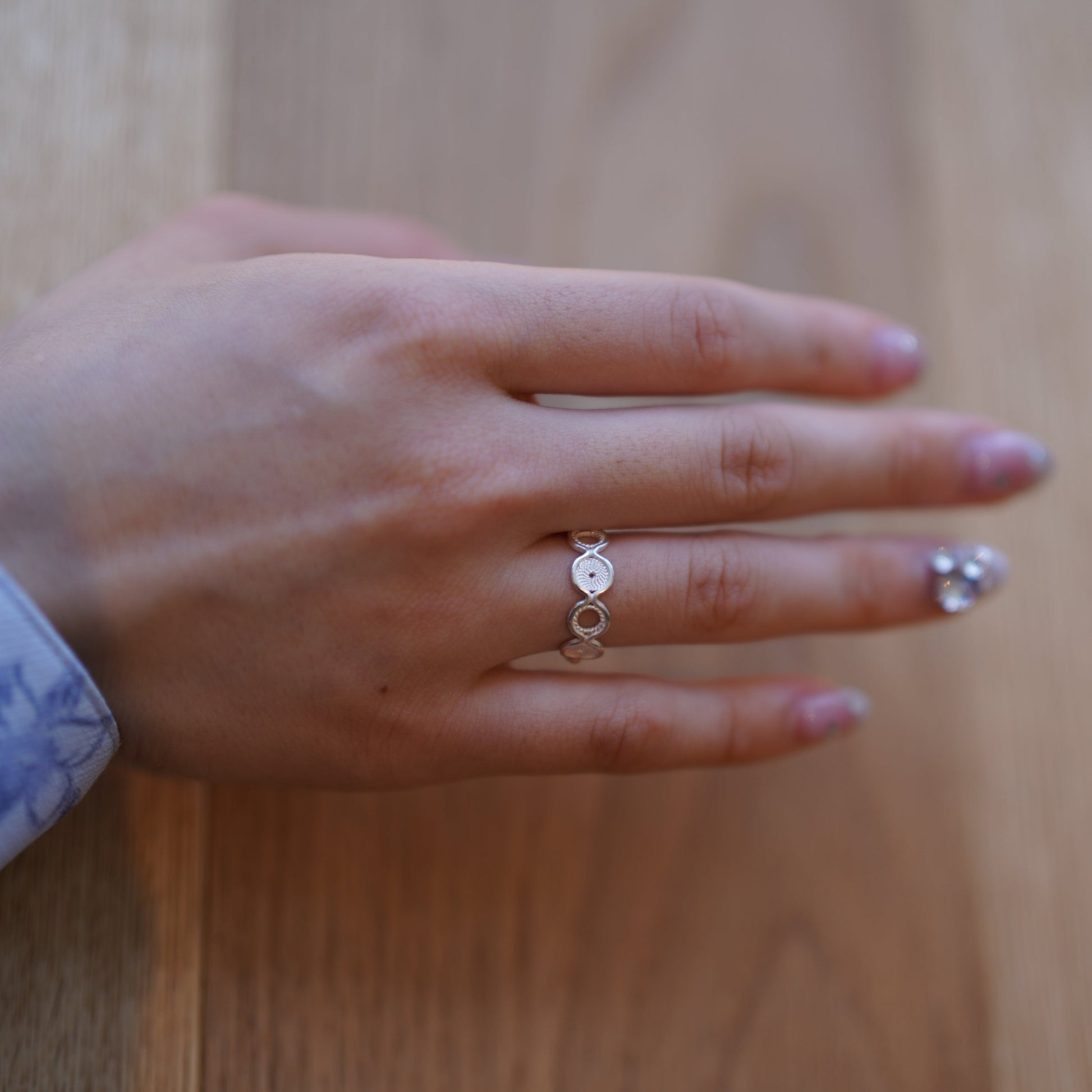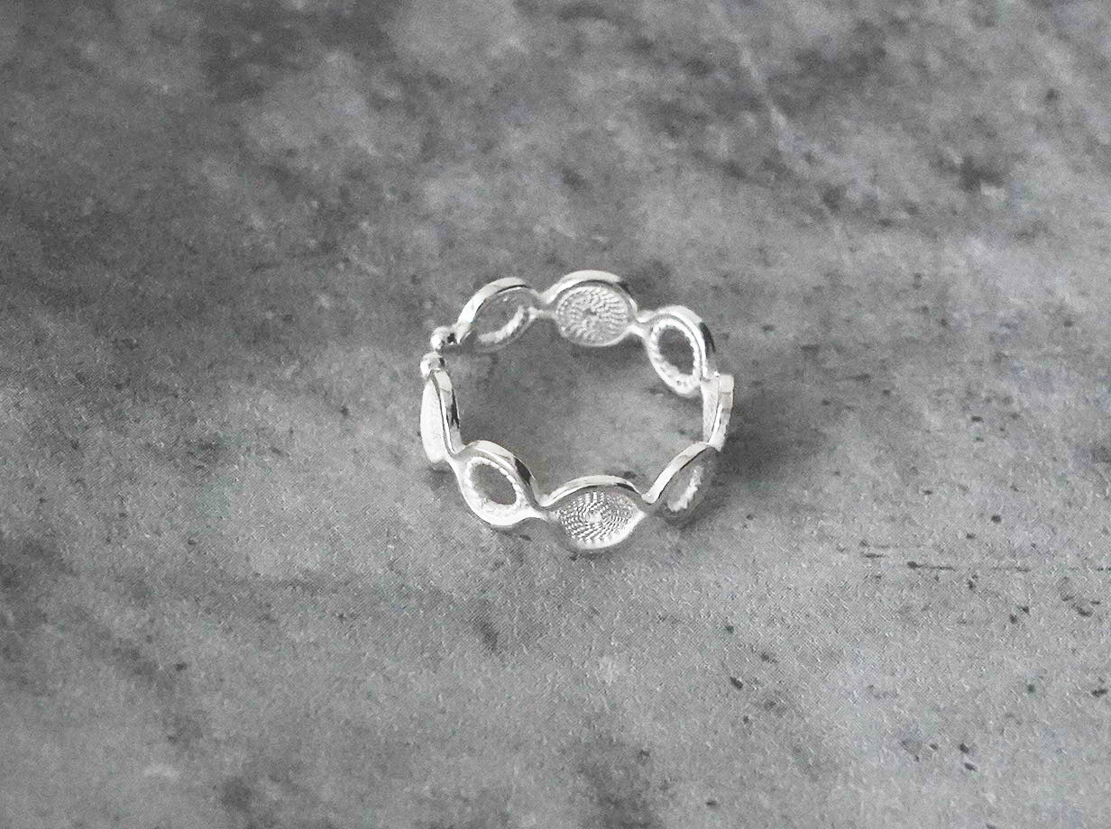 水滴の流れをモチーフにした、ふと目を止めたくなるような美しい水玉模様のリング。平戸と透かし模様のハーモニーがさらに銀製細工の魅力を伝えています。