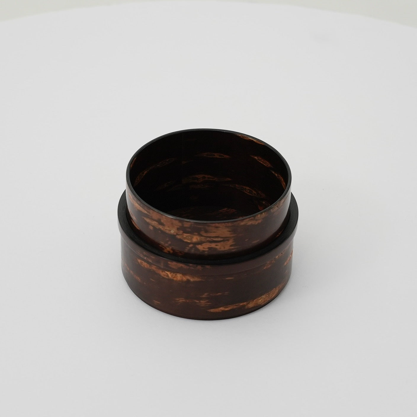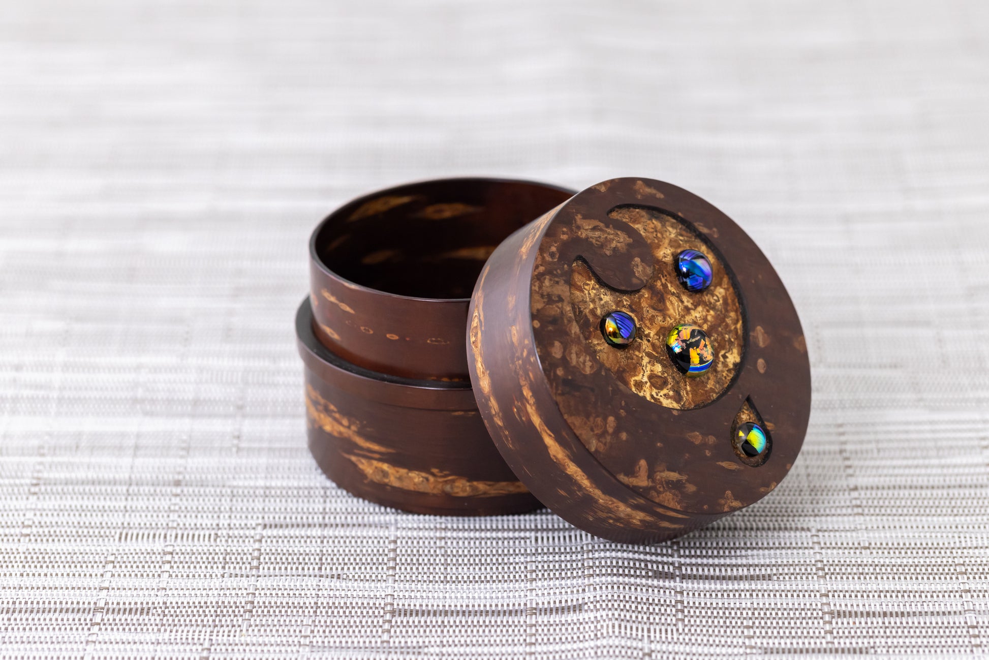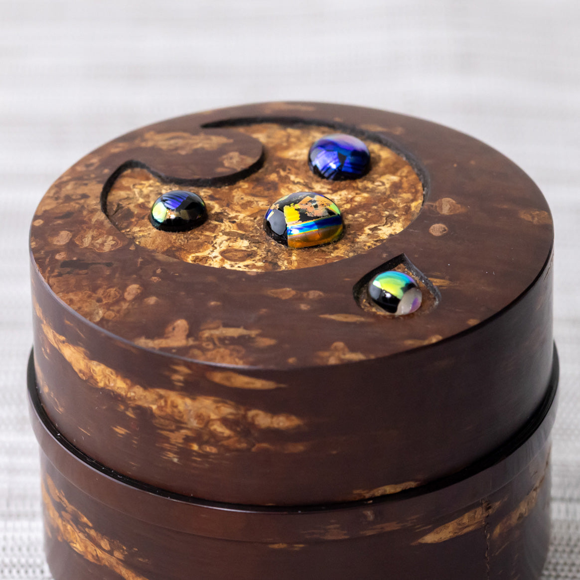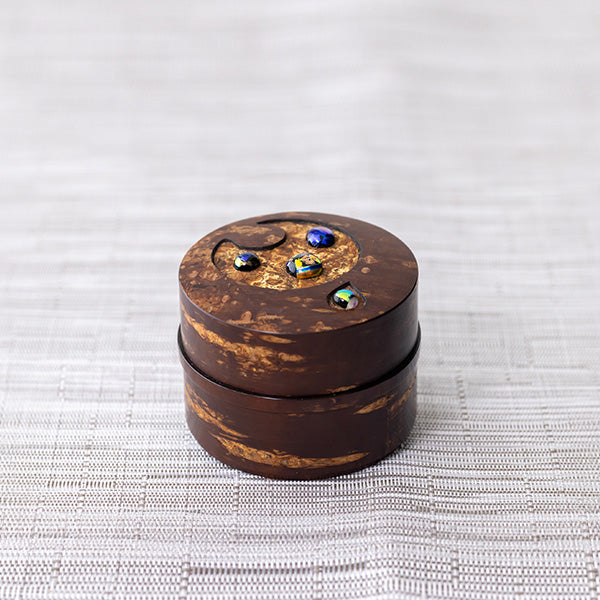 月と月からこぼれ落ちたしずくに二番皮を貼り、その中にガラスパーツを埋め込んであります。ガラスの光沢を生かすために桜皮は敢えて光るのを押さえてあり、中央の帯と内部は通常の磨き方をしてあります。