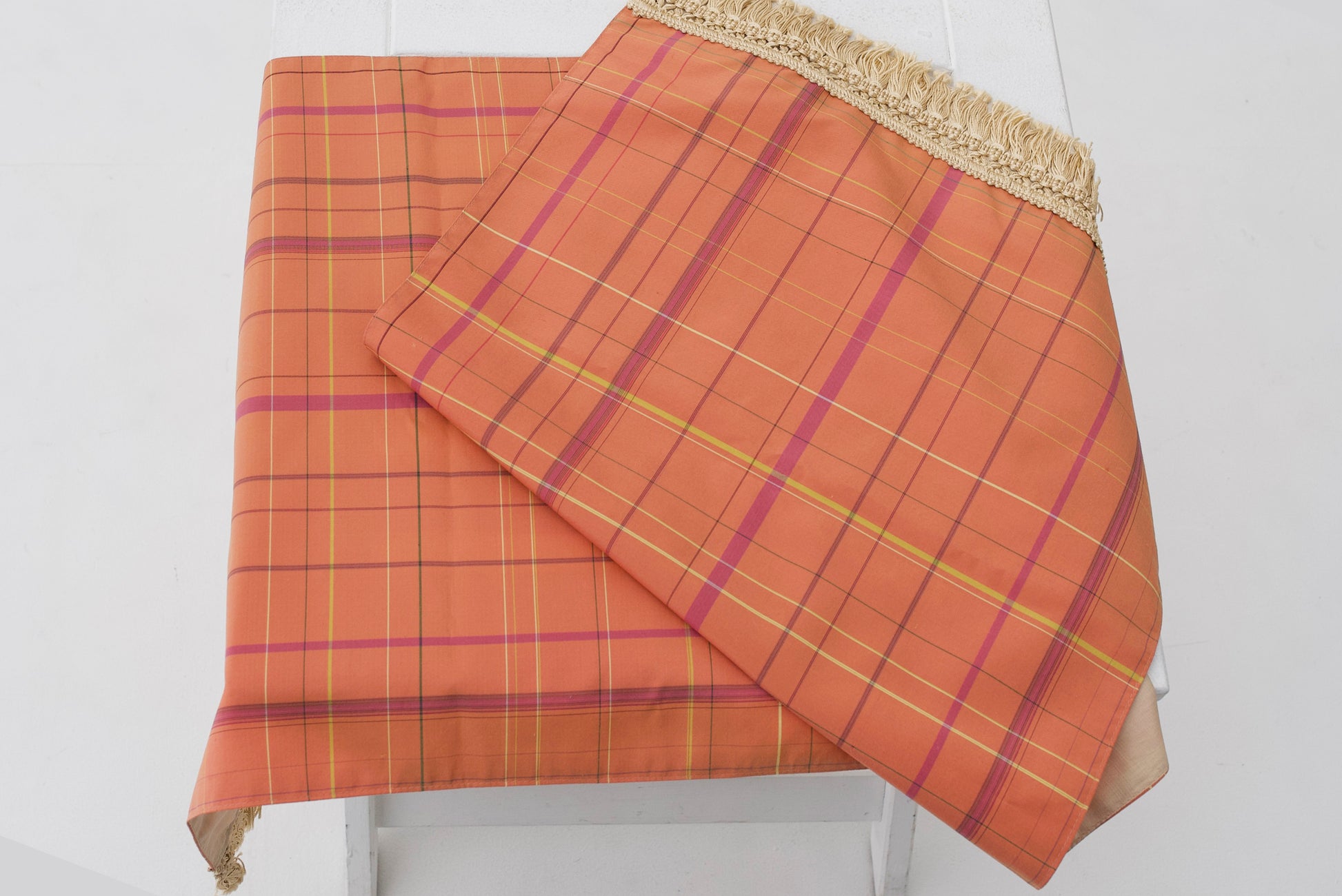 山つつじの葉を煮て染めたテーブルクロスは、温かみと上品さを醸し出します。カジュアルな色合いも秋田八丈の魅力の一つです。